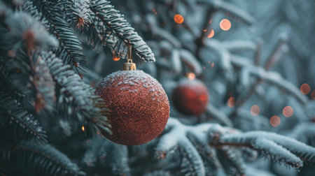Festive Christmas tree decorated with red ornaments, glowing lights, pine needles, creating warm holiday ambiance.
