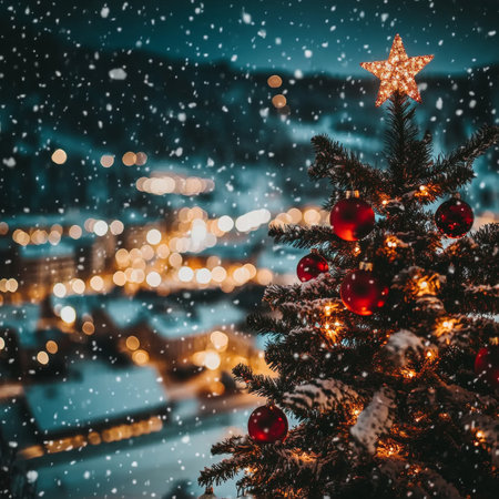 Snowcovered Christmas tree adorned with golden lights, red ornaments, shimmering star, evoking festive winter wonder.
