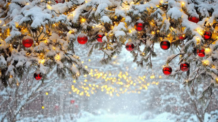 Festive Christmas tree decorated with twinkling lights, dusted with snow, set against winter wonderland backdrop.