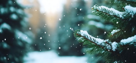 Snow falling on a pine branch in a winter forest. Peaceful and serene winter scene.