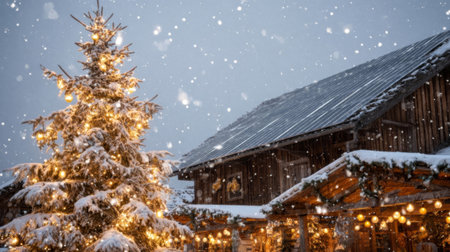 A serene winter scene featuring a beautifully lit Christmas tree and a rustic cabin surrounded by falling snow, creating a cozy and festive atmosphere.