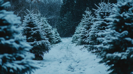 A dreamy snow-covered walkway lined with Christmas trees, adorned with glowing lights. The scene captures a serene, cinematic winter atmosphere, perfect for the holiday season.