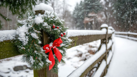 A beautiful winter scene featuring a snowy landscape with a festive Christmas wreath adorned with a red ribbon on a wooden fence.