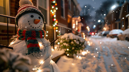A cheerful snowman adorned with a colorful scarf and hat stands in a snowy neighborhood decorated with glowing Christmas lights.