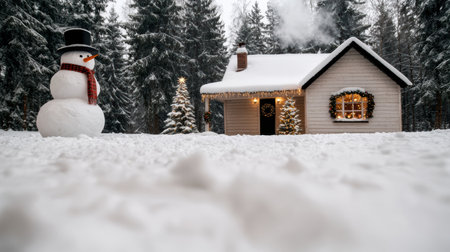 cozy winter cabin with snowman and christmas lights