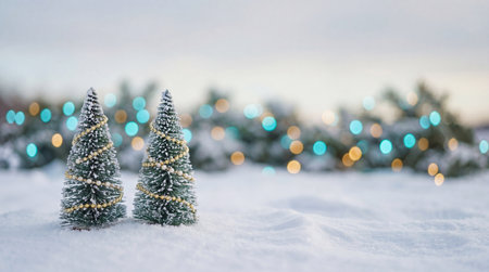 Snow covered miniature christmas trees in winter landscape with festive lights and gentle falling snowflakes at golden holiday twilight.