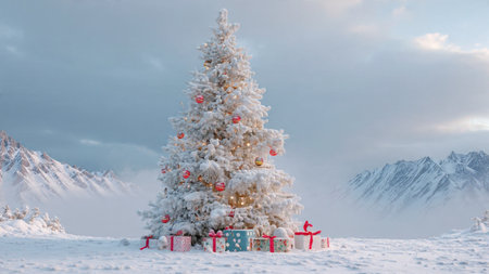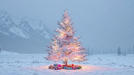 Snow covered evergreen tree with wrapped christmas presents and falling snowflakes in a serene festive winter holiday landscape.