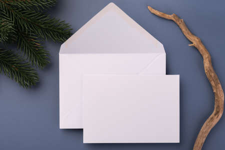 Christmas greeting card mockup with envelope and fir branches on gray background