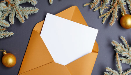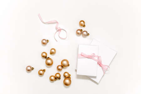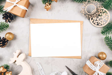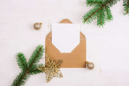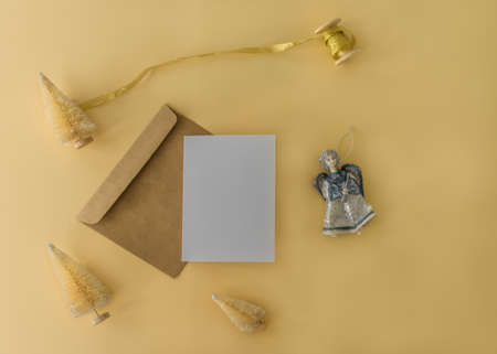 Blank Christmas Card and gold brown envelope with Christmas decorations. Xmas tree models and ornaments, top view. Holiday party workspace mock up, postcard with copy space.