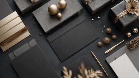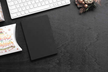 Top view of blank black cover notebook on black wood home office desk background with xmas decorations and Christmas gift box. Mockup Christmas background with copy space notebook..
