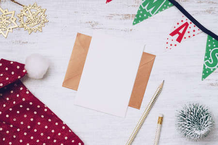Mockup Blank Christmas Card and gold brown envelope with Christmas decorations. Xmas tree models and Santa hat, christmas ornaments, top view. Holiday party workspace mock up, postcard with copy space