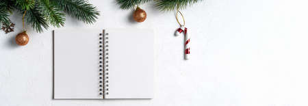 Top view of Christmas workspace with copy space and Christmas decorations with open notebook on white desk background