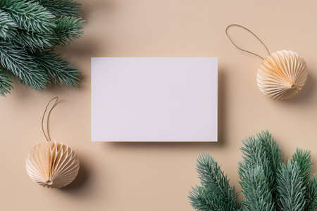 Winter holidays greeting card. White mockup board on green fir tree sprigs background. Copy space.
