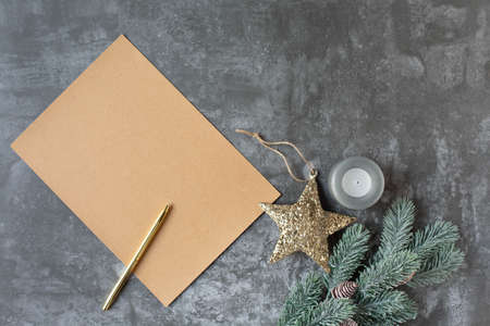 A sheet of beige paper, a gold pen and Christmas decorations are on a gray background. View from the top point. Free space for text.