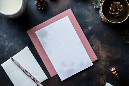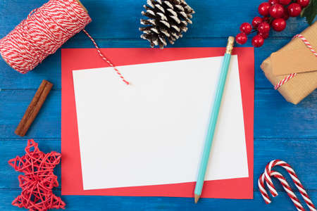 Writing letter to Santa concept. Top above high angle overhead close up photo of bright letter with white paper card and different beautiful decor on table