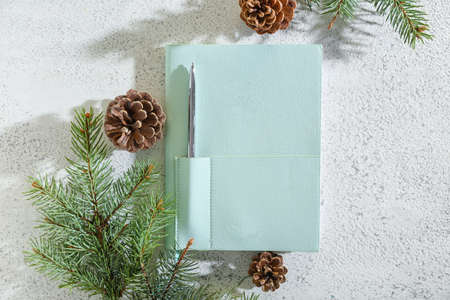 Christmas background with blue notebook, fir branches and decorations. Space for text. Top view. Copy space