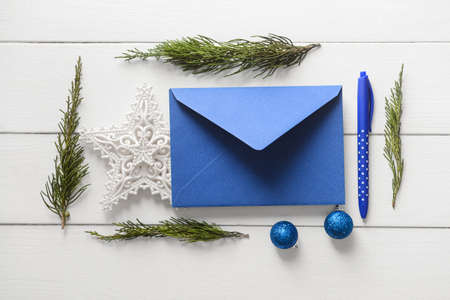 Christmas background with letter, envelope and feather pen surrounded by seasonal decorations