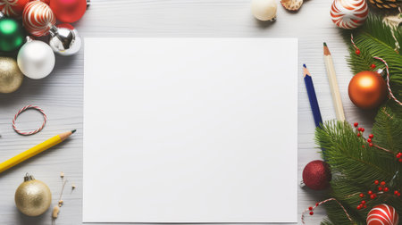 Mockup image of a blank white greeting card with christmas themed. A blank white paper decorated with a lot of christmas ornaments, colorful gift boxes. Blank space to fill. Christmas paper mockup image