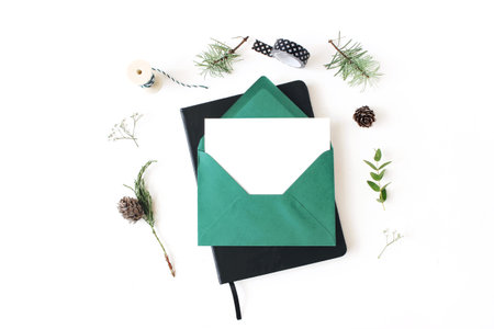 Christmas composition. Greeting card, envelope and note pad mock-up scene. Frame of pine, eucalyptus and juniperus tree branches, pine cones and baby breath flowers. White table background. Flat lay.