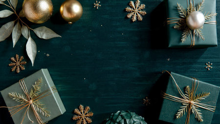 Premium winter layout with champagne-gold ornaments placed gracefully on a rich emerald background.