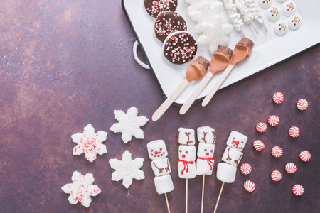 Flat lay. Variety of marshmallow toppings with peppermint and chocolate for hot chocolate and cocoa drinks.