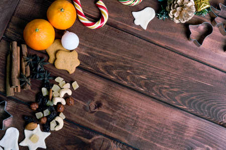 On a wooden desk background Christmas composition - candy cane, dough figurines, Christmas-tree branch Christmas balls, raisins, nuts, cinnamon sticks, cookies, star anise, mandarins bump