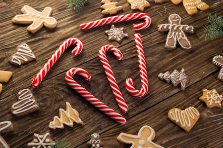 Chrismas cookies and candy canes on wooden background. Holiday mood. Pine. Top view.