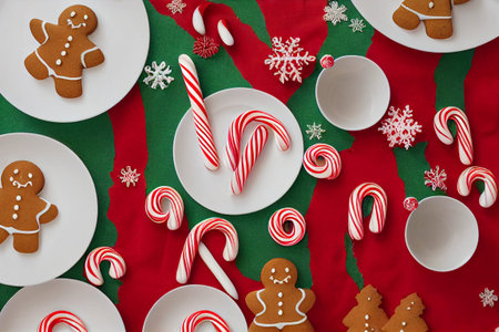 Christmas sweets set. Assorted festive Christmas and New Year sweets, traditional candy and cookie. Flatlay with candy cane candies, gingerbread, sweets, simple pattern top view