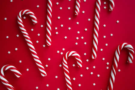 Christmas background with candy canes. Red sweet sticks with small stars. Flat lay, overhead view. Poster, banner, greeting card template. Festive backdrop. Holiday season