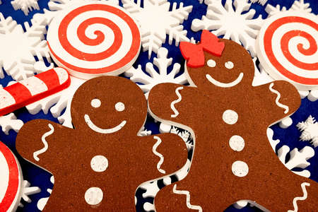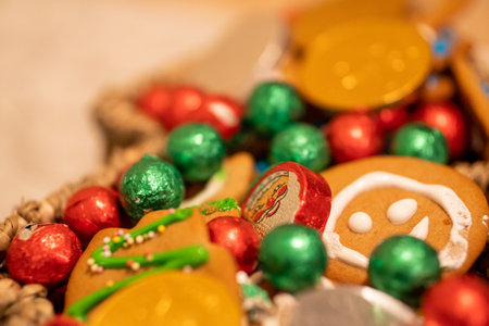 A selective focus shot of gingerbread Christmas cookies and candies