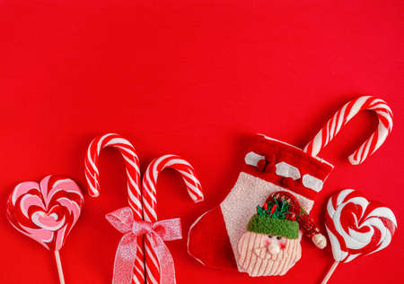 Christmas santa boot with candies on red background. Flat lay, copy space. Greeting card