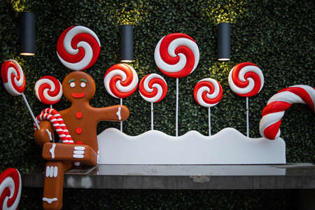 a lot of white foam snowflakes, candy lollipop, gingerbread people Christmas decor for home, office, shop