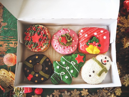Christmas donuts or doughnuts, holiday winter sweets with chocolate filling and sprinkles. Christmas donuts or donuts as a food background for your design.