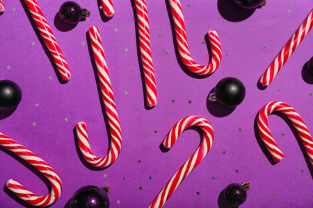 Composition with sweet candy canes and Christmas balls on purple background