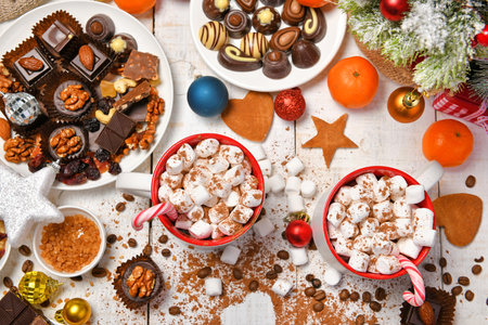 sweet food top view background for merry christmas or new year holiday decoration - chocolate candies, tangerines, cookies, marshmallow and cocoa latte on white wood
