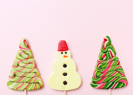 Lollipops new year sweets. Candy christmas tree, top view flat lay on pink background. Sweet sucker, lollipop snowman, candy, isolated minimal concept above decoration, new year food background