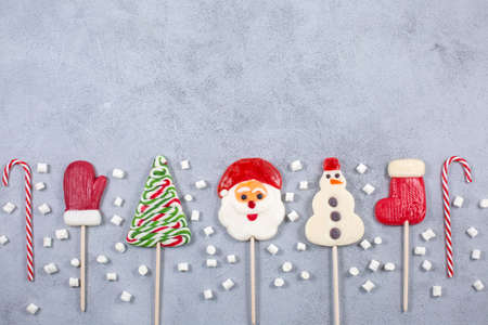 Christmas candies and mini marshmallows on gray background.