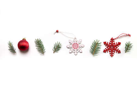 Christmas composition. Red and white decor elements that are used to decorate the Christmas tree. Winter, New Year's concept