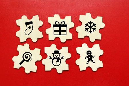 Wooden puzzle pieces with christmas symbols on a red background.