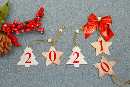Christmas decor 2020 on gray background. Flat lay, top view.
