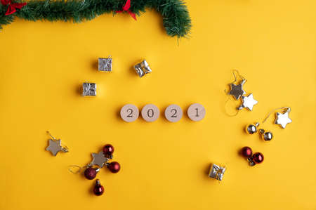 2021 written on wooden cut circles placed on yellow background with holiday ornaments.