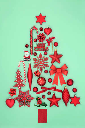 Christmas tree shape with red bauble objects on blue background and merry christmas sign. Abstract Xmas concept for the festive season. Top view, flat lay.