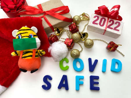 Tiger symbol of 2022 new year with protective face mask. Safe Christmas holiday celebration concept during coronavirus pandemic.