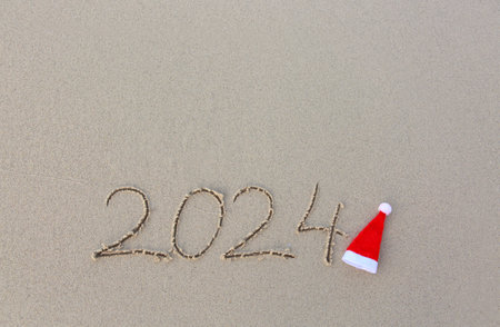 Happy New Year 2024 text on the sea beach.