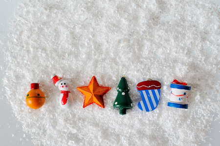 Christmas toys on white snow background