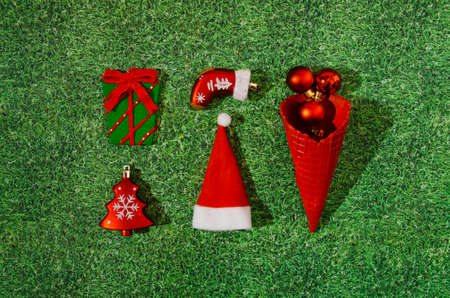 A bright infographic or pattern made of Christmas decoration: a Christmas tree, a wrapped gift, a boot, Santa's hat and a red ice cream cone with red balls, on artificial grass as background. Christmas or New Year symbols in surreal creative concept. End of the year hollidays in green nature artistic design.