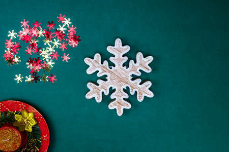 December season composition, top view with copy space on green background. Christmas composition with ornaments and decorations.