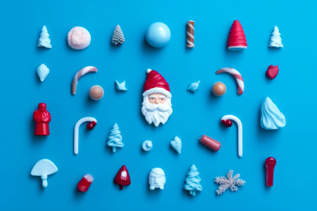 A collection of Christmas ornaments, including candy canes, stars, and a Santa hat, arranged on a blue surface against a white background.