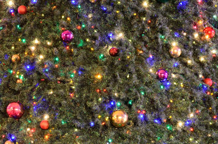 Christmas tree decoration festive background. Various toys and baubles and holiday lights on the tree.