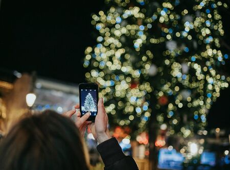 Unrecognizable woman taking a photo of a Christmas tree on a mobile phone. People from behind.